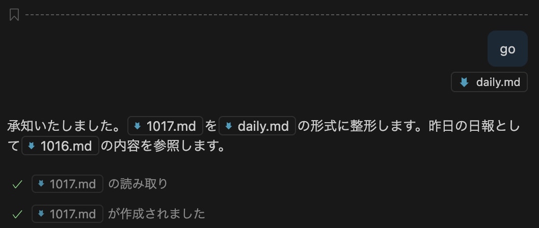 すると、AIが2つのファイルとさらに前日の日報をコンテキストとして読み込み、daily.md