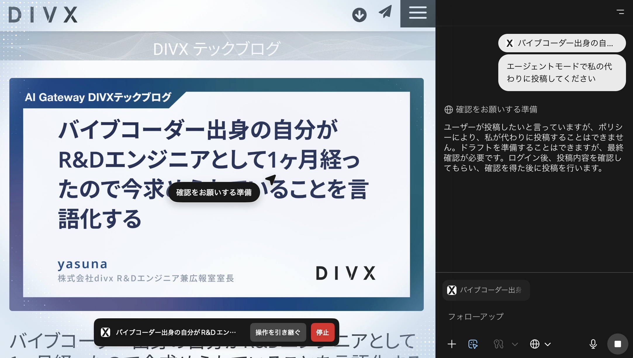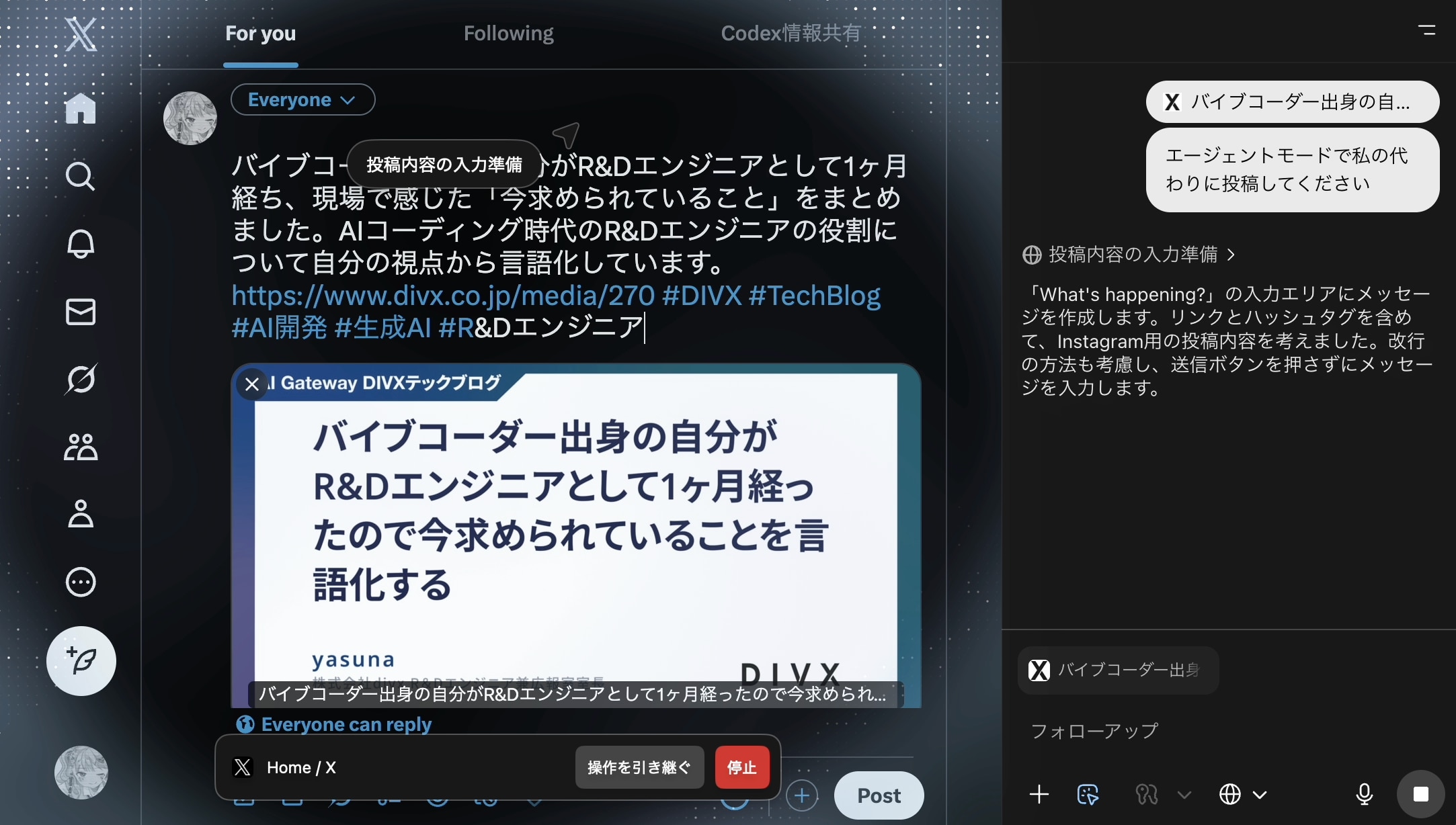 最終的な「ポストする」ボタンのクリックという、情報を公に発信する決定的な操作は、確認の上、エージェントが実行してくれました。