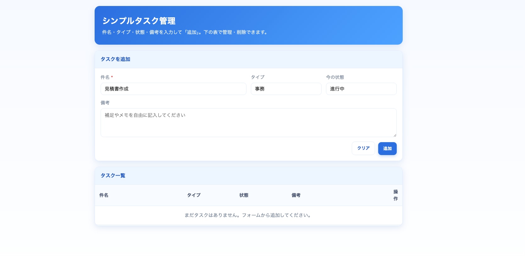 この時点では、「タスクを入力して表示するだけ」の画面が出来上がります。データの保存や時間表示はありませんが、見た目の確認はできる状態です。