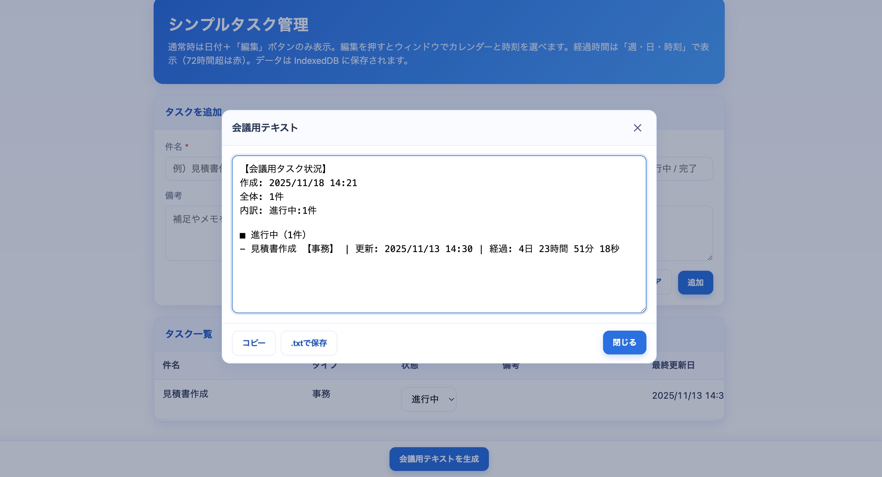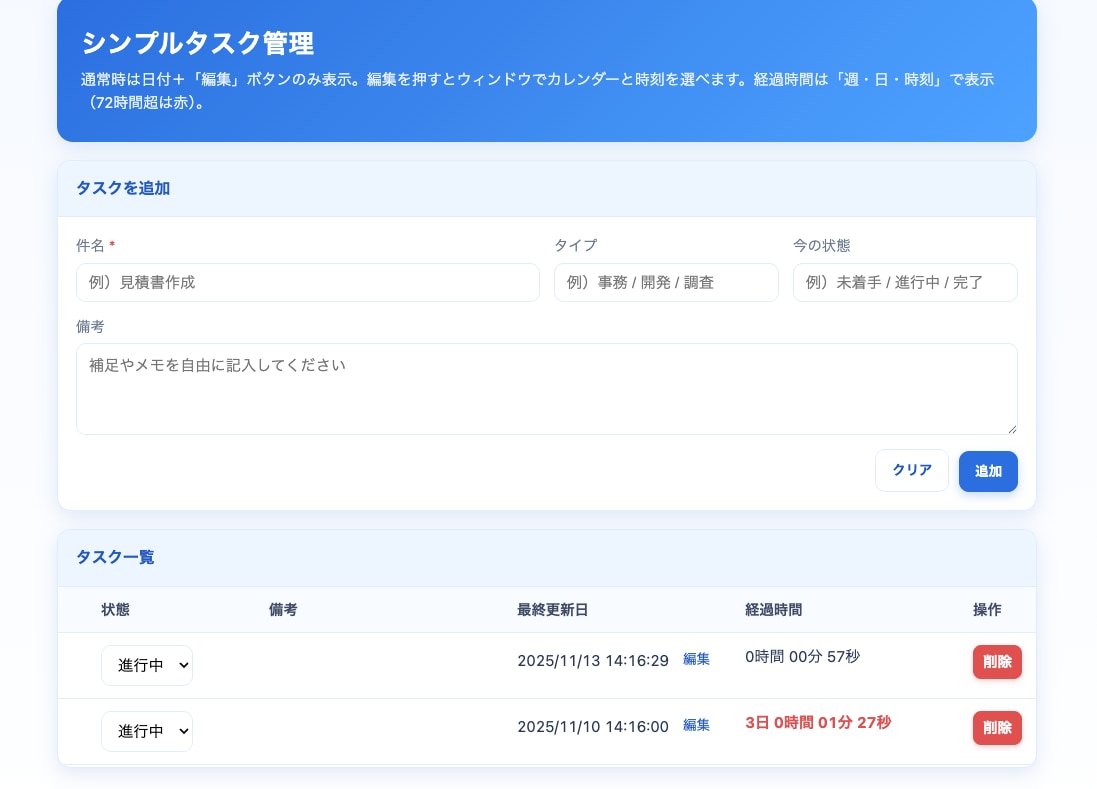 - 経過時間の可視化: 最後に更新してから何時間が経過したかを表示し、放置されているタスクを炙り出したい。