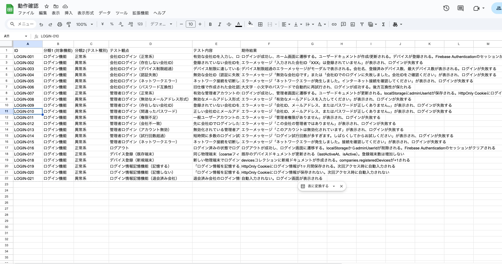 「login.md を読んで、テストケースを考えて、 test-item-listシートに書き込んで」というと作成してくれました。