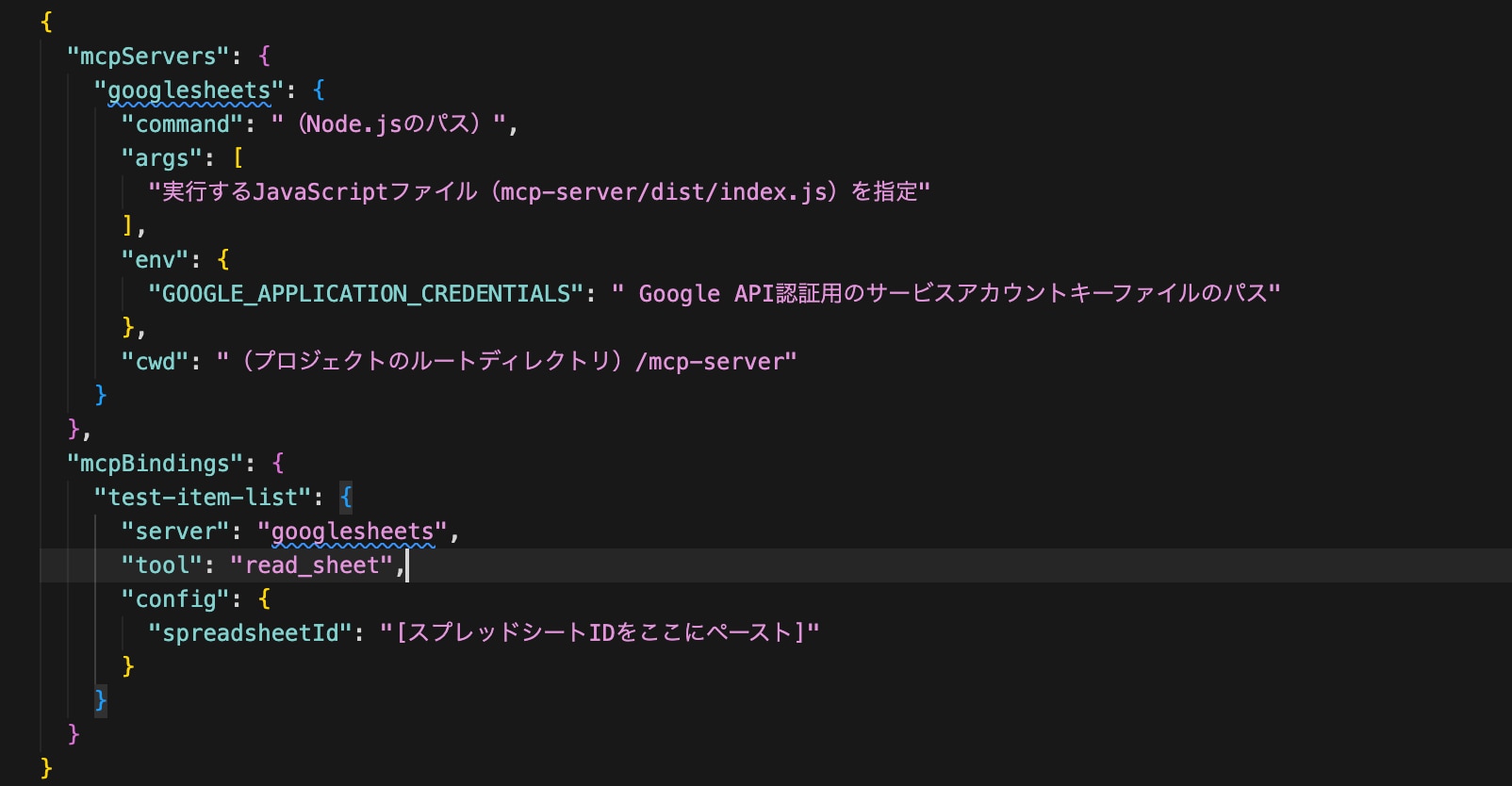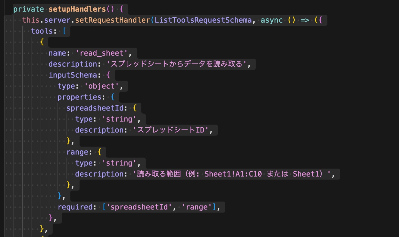 上記でご紹介した3つの機能(read_sheet、write_sheet、list_sheets)を実装しました。npm installを実行後、npm run buildでサーバーの実行ファイルとなるdist/index.jsを生成しました。