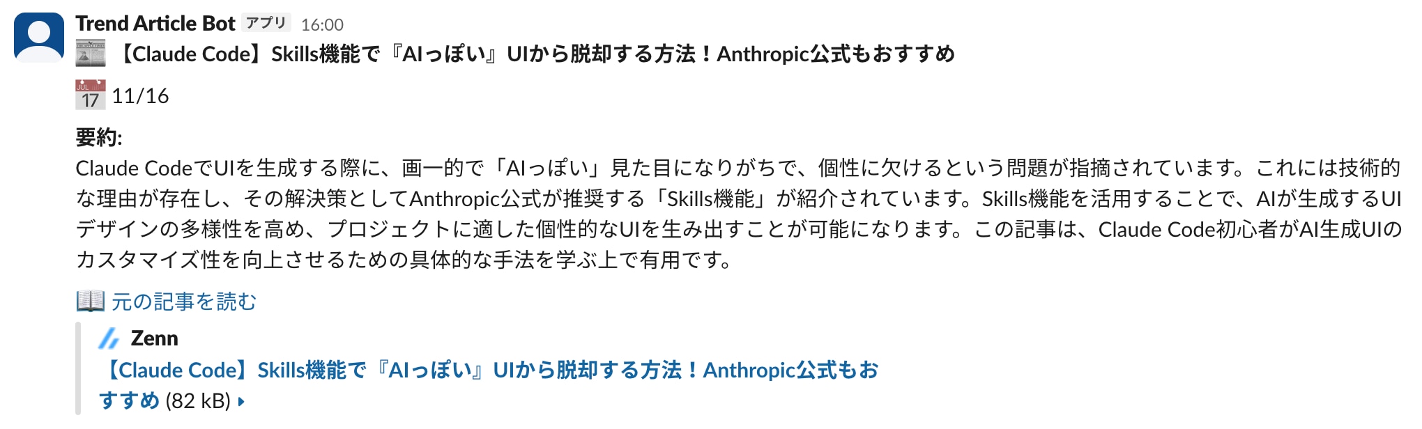 記事取得・要約・通知を自動化することで、情報収集効率が大幅に向上し、チーム全体で知見を共有 できる仕組みを構築できました。