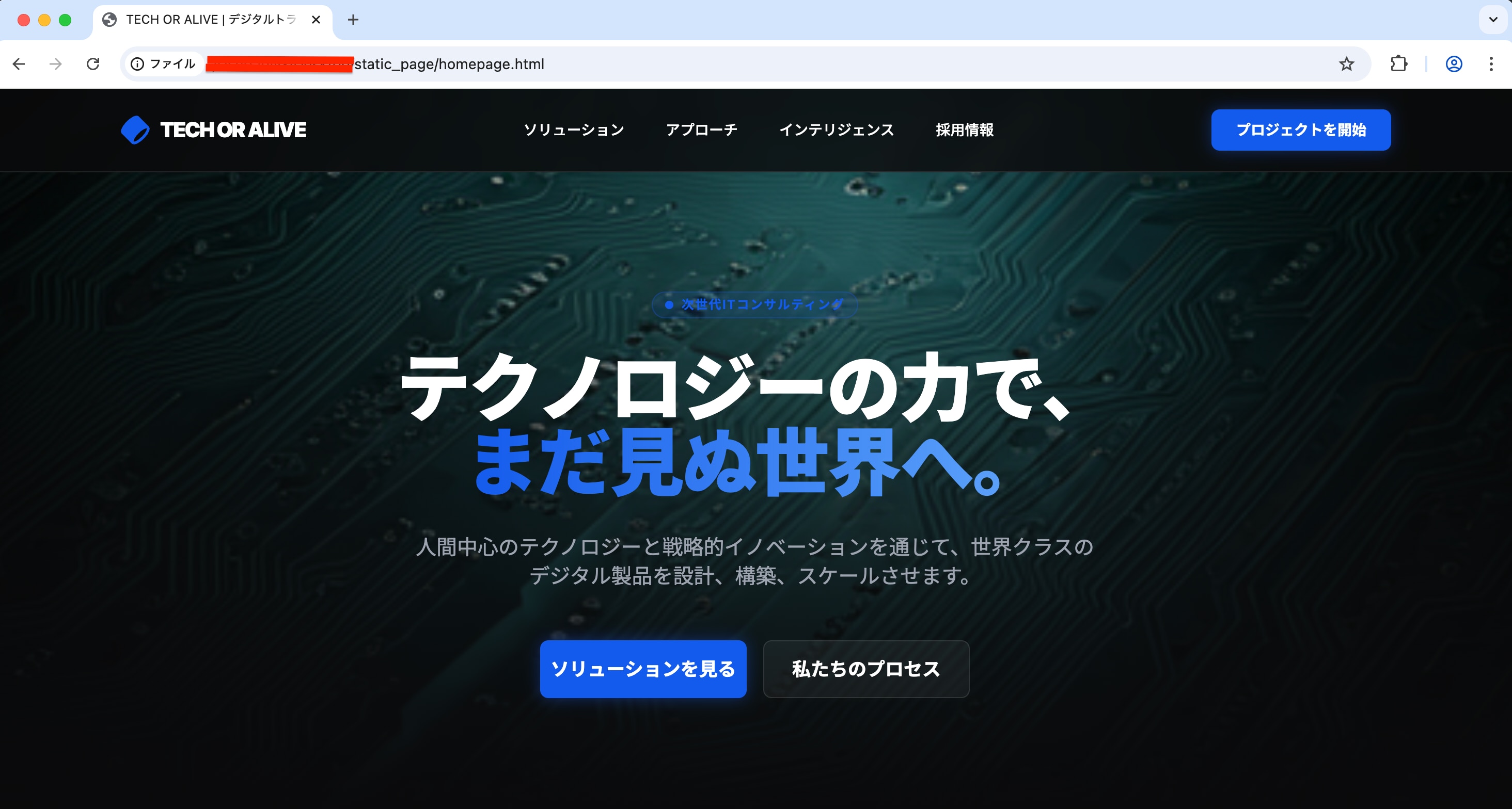 実際にトップメニュー(ソリューション、アプローチ、インテリジェンス、採用情報)のいずれかをクリックすると、メンテナンスページへ正しく遷移することを確認できました。