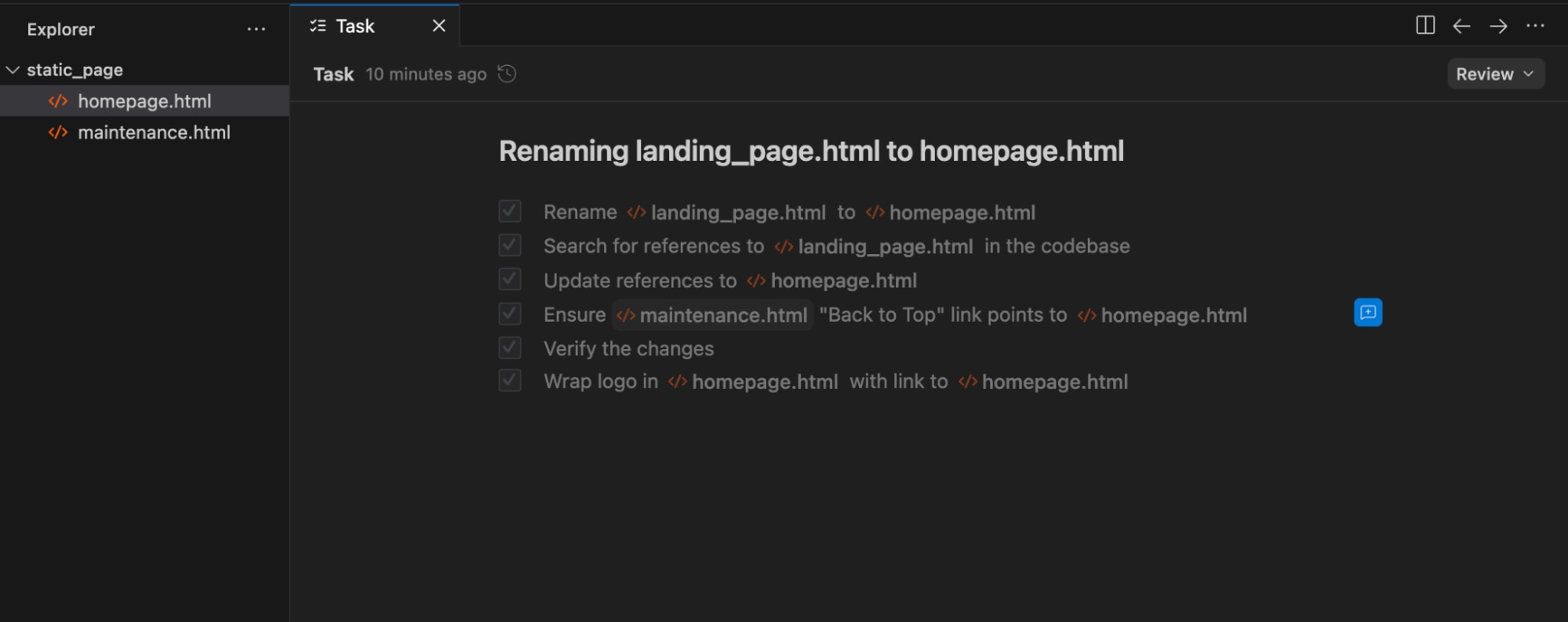 また、指示に対してどのようなタスク(処理)が行われたかが、以下の画像のようにタスクとして表示されます。 具体的に何が実行されたかを簡単に追跡できるため、作業内容の整理にも役立ち、非常に便利だと感じました。