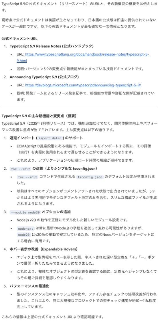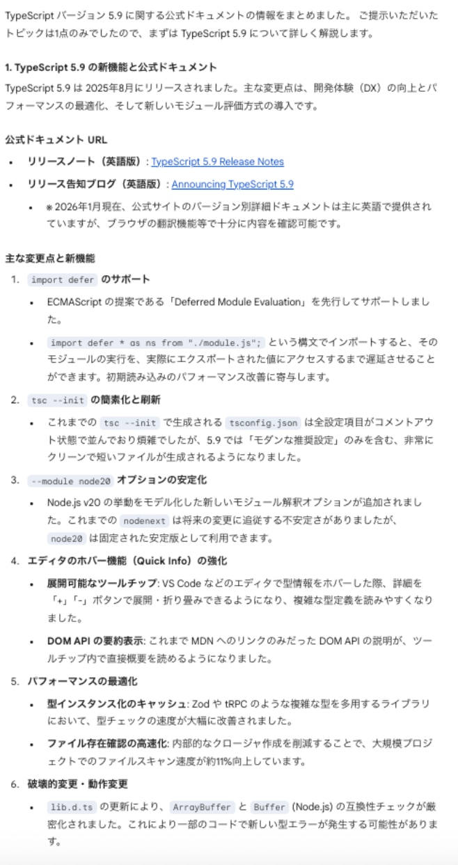 Geminiは初回と同様、安定して公式ドキュメントへ到達しました。import defer や tsc --init の改善など、技術的な要点もClaudeと遜色なく(あるいはそれ以上に)網羅されています。