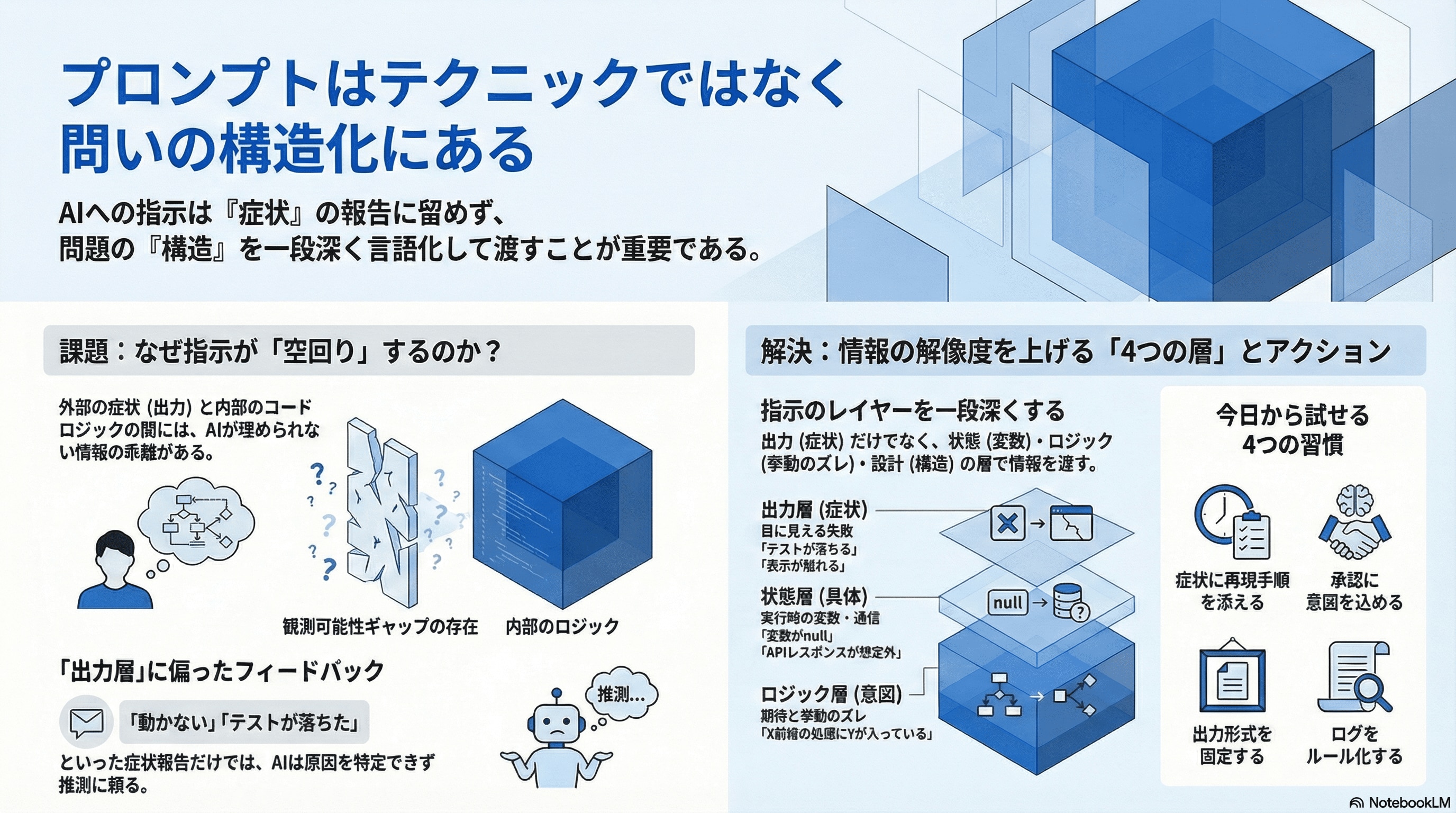 出力層しか渡せない時、AIは広く推測するしかありません。状態層やロジック層まで言えると、修正候補はかなり絞られます。設計層まで言えると、場当たり的な修正より再発防止に近づきます。